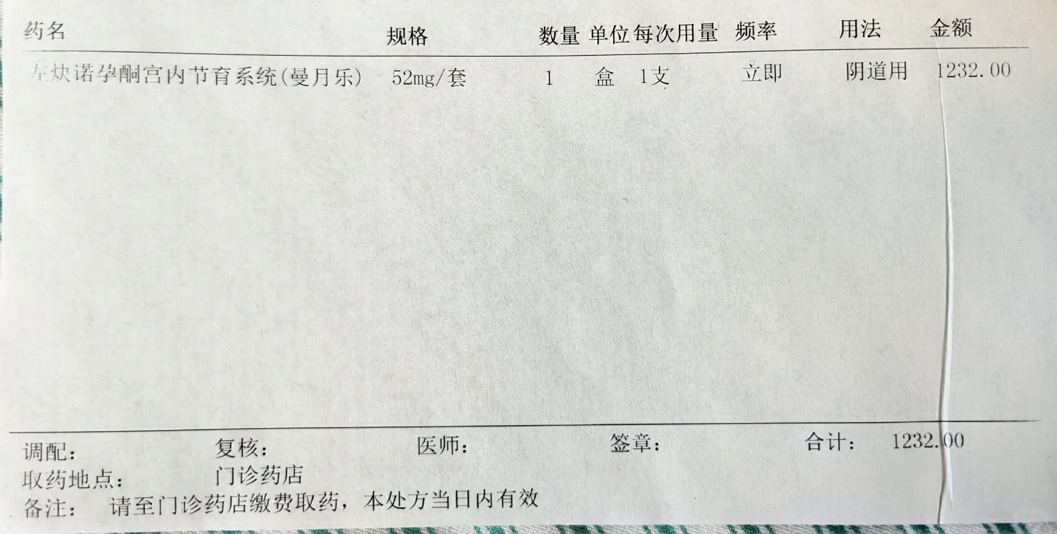 3.22入院,3.24出院,宫腔镜手术去除子宫内膜息肉,安放曼月乐环。曼月乐环本身自费(1232元),其余费用医保外现金自付1